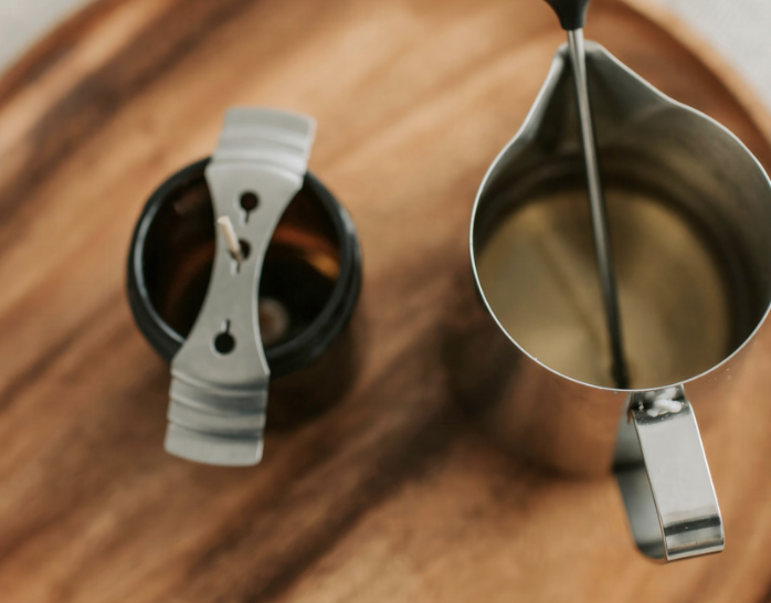 Candle making supplies on a wooden tray; includes a brown glass jar with a wick holder and a metal pot with a thermometer.